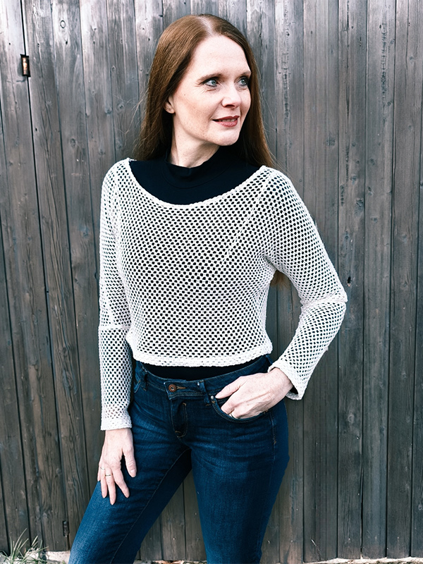 Eine cropped-Länge endet 6 cm unterhalb der Taille und ist im Schnitt markiert, wie auch die normale Shirtlänge. Unter dem Pulli kannst du das Top LANDA tragen, speziell geeignet um die BH-Träger und den Bauch nach Wunsch zu bedecken.
