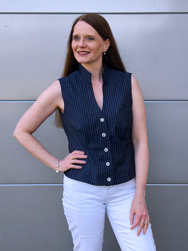 Der elegante Stehkragen verleiht der Weste eine klare, stilvolle Linie. Wenn du es verspielter magst, kannst du optional Kapärmel ergänzen.